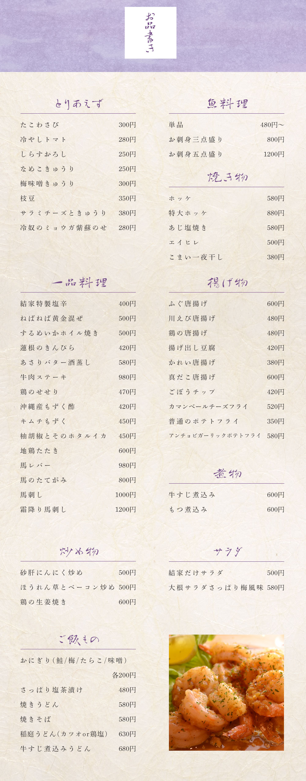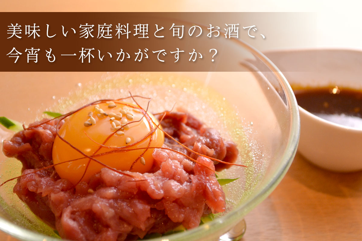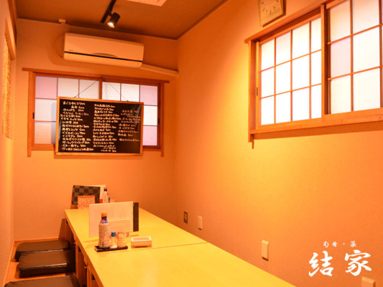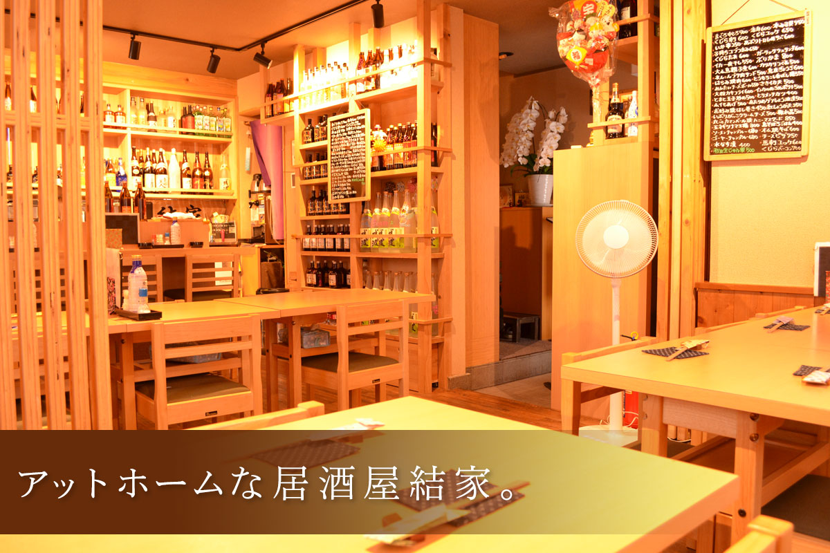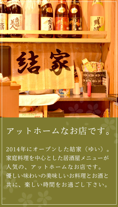 2014年にオープンした居酒屋結家(ゆい)。アットホームなリラックスした空間で、旬の食材を使った家庭料理と、美味しいお酒を味わいたい方にぴったりのお店です。駅近で、アクセスも抜群。名物は、新鮮な素材だからこそ味わえる馬刺しや馬レバー、馬肉ユッケ。冬季限定の、もつ鍋も人気です。お一人様はもちろん、ご宴会・お集まりにも最適なご宴会メニューも7品4000円~ご用意しております。内容やご予算など、お気軽にご相談くださいね。